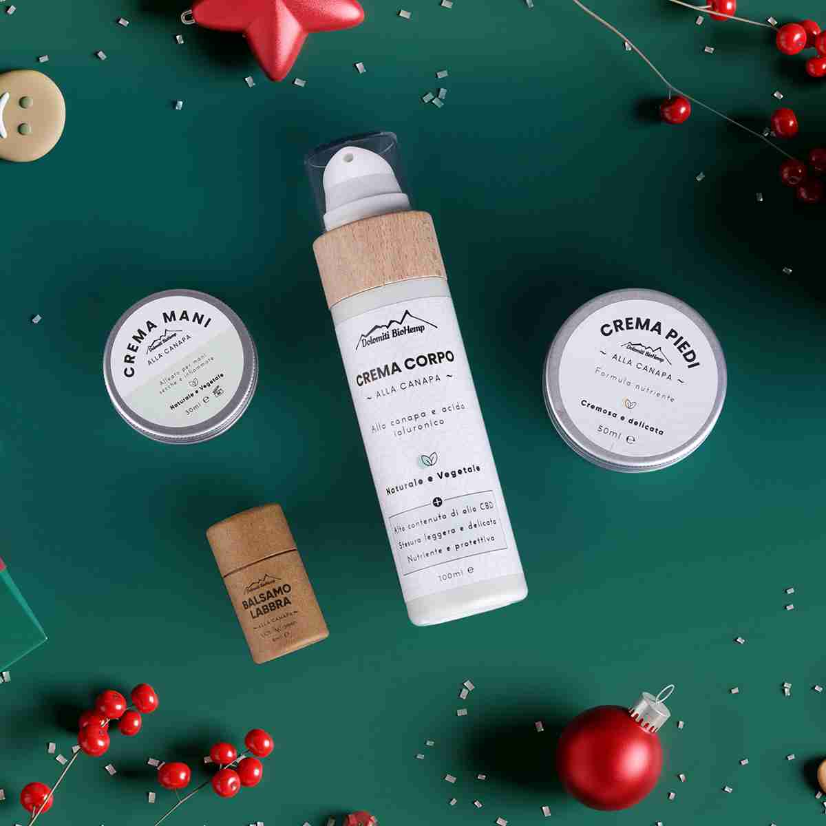 1 Crema Corpo 100 ml – 1 Crema Mani 30 ml – 1 Balsamo Labbra 8 ml – 1 Crema Piedi 50 ml
