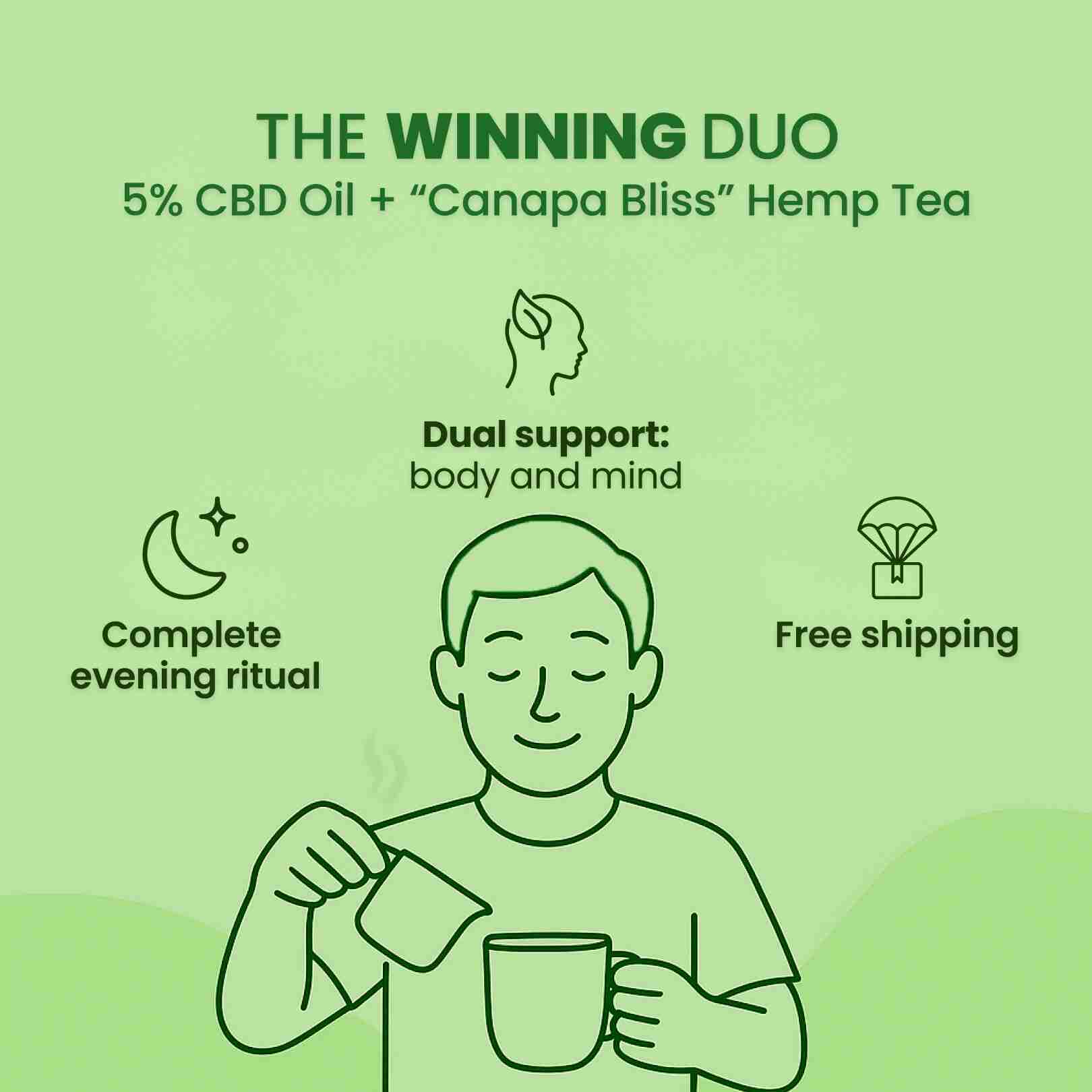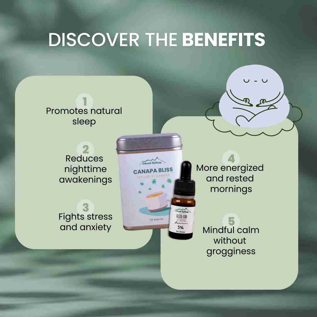 The Sweet Dreams Kit combines 5% CBD Oil and Hemp Tea to create the perfect evening ritual. Two 100% natural products from our Trentino farms work in synergy to promote deep, restorative sleep. A complete solution for those seeking a natural approach to rest, without side effects.