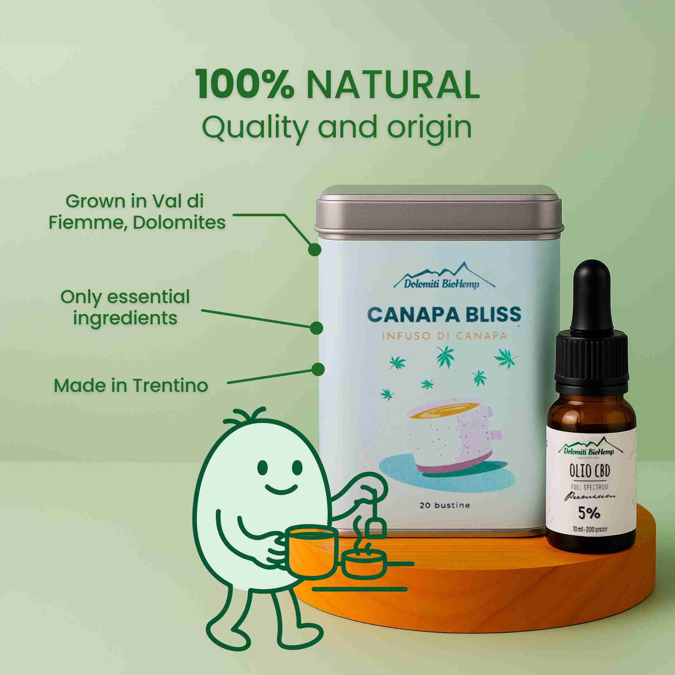 A powerful duo of 5% CBD Oil and Hemp Tea, both made with 100% natural ingredients from our farms in Val di Fiemme, in the Trentino Dolomites.