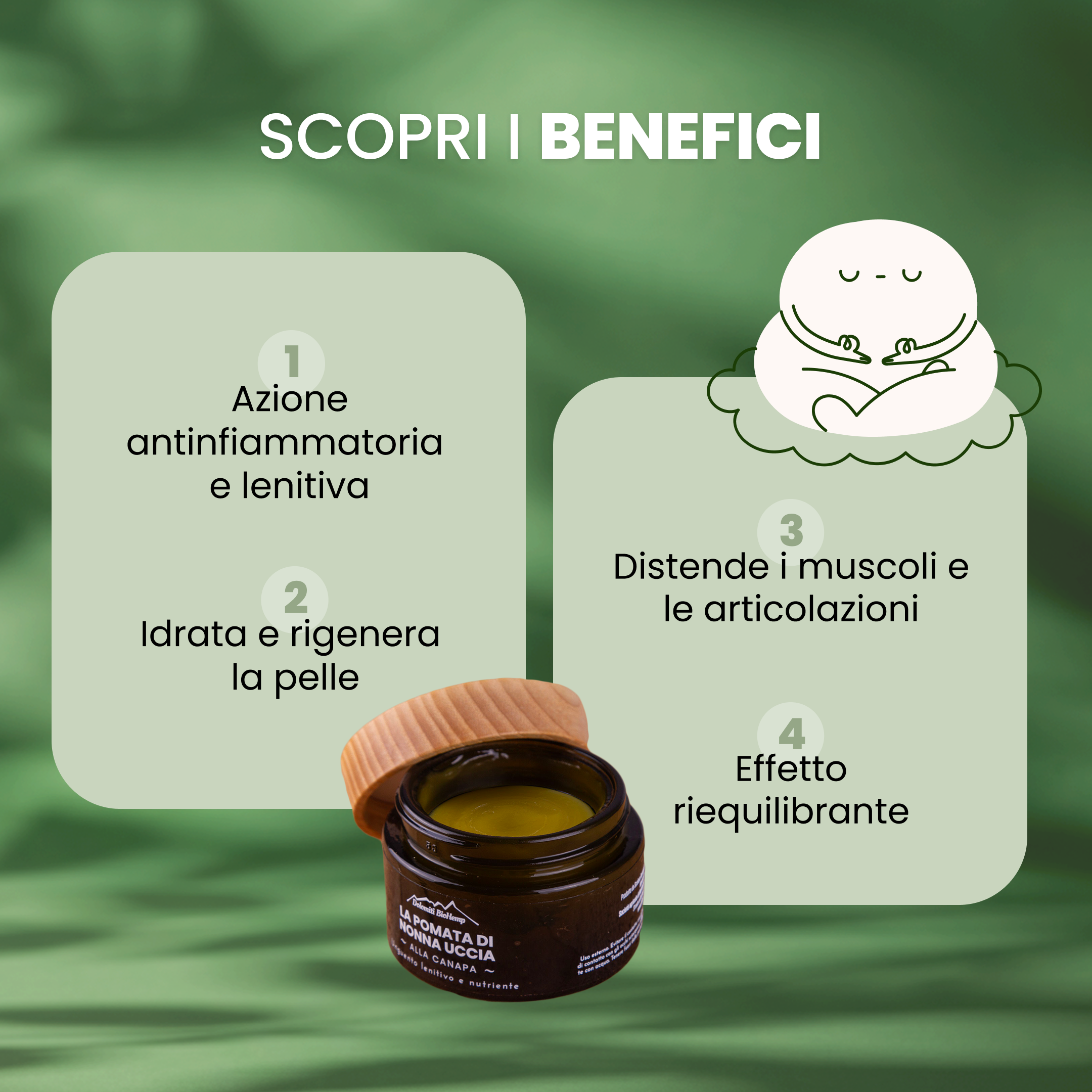 We have named it after our grandmother, an expert in the creation of herbal creams, who namely invented our Nonna Uccia’s pain relief cream and still produces it in a completely artisanal way.